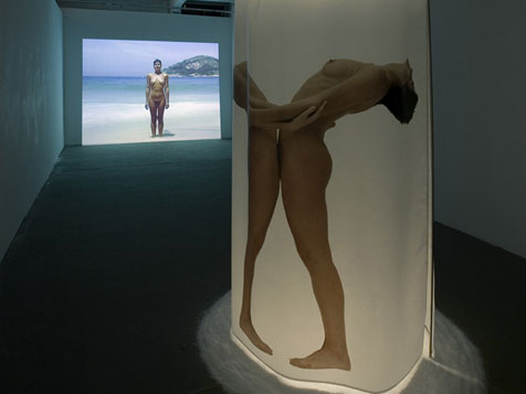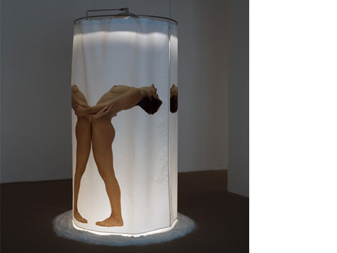 (...) pensada para Água de Colónia na continuidade de Talvez eu seja daqui. Baptismo/Viagem/Nostalgia é um dispositivo de duche cilíndrico, resguardado por uma cortina: a corrente de água é substituída por uma corrente de luz; o chão está coberto de sal, de onde sobem os sons de uma trilha sonora que mistura sons de água e de guitarra portuguesa, espalhando-os discretamente por todo o recinto da exposição. Baptismo/Viagem/Nostalgia incorpora contudo elementos de outras experiências, designadamente Da Terra ao Céu e Karnapidásana de 2004, iconograficamente presentes no resguardo do duche, que ostenta duas impressões em escala natural de uma imagem de Rute executando uma retroflexão, em dupla consigo mesma. Esta posição insere-se num conjunto de ásanas de Yôga executados para o conjunto Da Terra ao Céu, e recupera esse universo de significados: a passagem de um modo de ser profano para um modo de ser não profano por meio de uma psico-fisio-tecnologia que promove a experiência directa e empírica do complexo corpo/mente. Esta mudança ou passagem de plano de existência – que rompe o tempo e o espaço quotidianos, profanos, e instaura a vivência de uma realidade não quotidiana, não profana – fica ainda sugerida no recorte simétrico da imagem da retroflexão. (…)