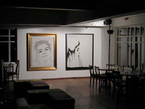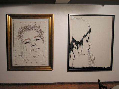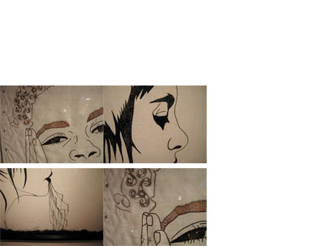 Ambos os auto-retratos são tributos ao amor, cuja execução laboriosa e devotada - em pontos tradicionais das Caldas da Rainha, no primeiro bordado, e em ponto de pé-de-flor no bordado mais recente – se institui como um equivalente plástico e poético da vivência amorosa, apresentando a coreografia dinâmica mas ínfima de cada um dos minúsculos e apertados circuitos repetidos pelo fio do afecto, desde a unidade até uma construção preenchedora e global. O rosto tranquilo e quase sorridente do primeiro bordado, apoiado numa mão e pousando o olhar de frente no observador, em cujo cabelo se encaixam em perfeita ordem orgânica as volutas tripartidas do ponto tradicional das Caldas, é a imagem sem sobressaltos, imperturbada, do esplendor da descoberta amorosa. O rosto do segundo bordado apresenta-se de perfil e emerge de uma volumosa cabeleira contornada, cujas pontas, preenchidas e acentuadas, caem ondulando em desalinho e em várias direcções, enquanto da boca saem linhas bordadas que descem com uma palavra escrita, “amor”, para pousarem no espaço do caixilho que emoldura a peça, acumulando-se num agitado e denso emaranhado de fio de seda, completando a imagem paradoxal do devir amoroso, inesgotável e suplicante.