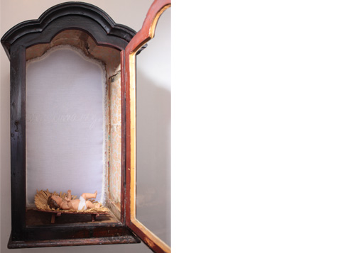 Madeira, vidro, cerâmica (menino nas palhinhas), linho bordado a fio de seda, papel, entre outros materiais