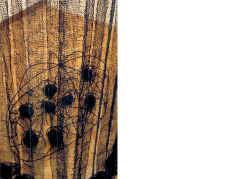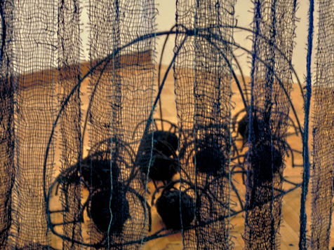 Rede de linho tingida, varão de ferro, corda de sisal tingida