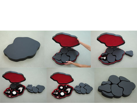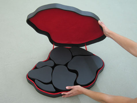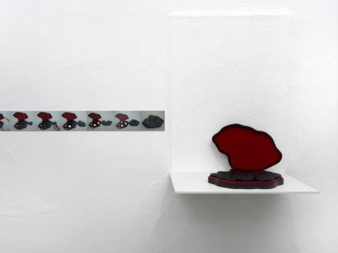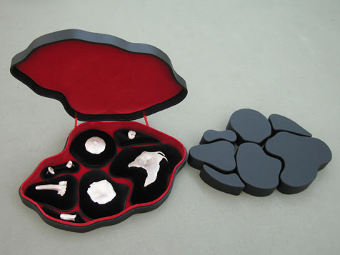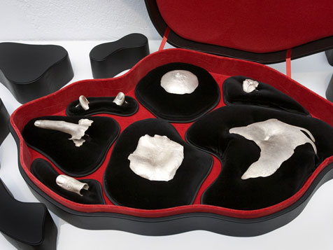 (...) A peça Mala do meu corpo… (fig.2) (Do meu umbigo de prata/Do meu beijo de prata/Do meu dedo de prata/Do meu mamilo de prata), apresenta réplicas em prata de partes do seu corpo, processo que a artista desenvolve desde 2003, iniciado com Beijos de Prata. A apresentação de fragmentos do seu corpo é recorrente no discurso auto-referencial, multissensorial e proprioceptivo de Rute, e inclui experiências tais como Fragmentos de Corpo (2003), Porto 2001/Rio de Janeiro 2003 (2004), e Objectos Espelho (2005). Rute refere-se assim a estes fragmentos de si: «São dádivas de mulher: são dedais de costureira, umbigos de mãe, bocas que beijam e alimentam, mamilos que alimentam e se deixam beijar, chupar e lamber pelo recíproco prazer, dedinhos que apertam a camisa do seu amor». A expressão do afecto, preferencialmente associada à vivência do complexo corpo/mente nas acções elementares necessárias à sua subsistência, transforma estes objectos inanimados em algo mais do que representações miméticas de um corpo original; réplicas evocativas dessas acções elementares, estes fragmentos significantes rememoram as acções originais de que são o ícone, garantindo que estas nunca serão meramente automáticas ou insignificantes, mas eventos sempre carregados com a vitalidade da acção original, com a disponibilidade, a espontaneidade, e a potencialidade do modo de ser do momento primordial. Deste modo, os fragmentos do corpo exprimem as acções originais como outros tantos pretextos diários para transcender a esfera do profano, do quotidiano, para efectuar a passagem do modo de ser profano para o modo de ser não profano, ou sagrado.(...)