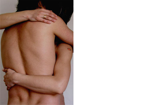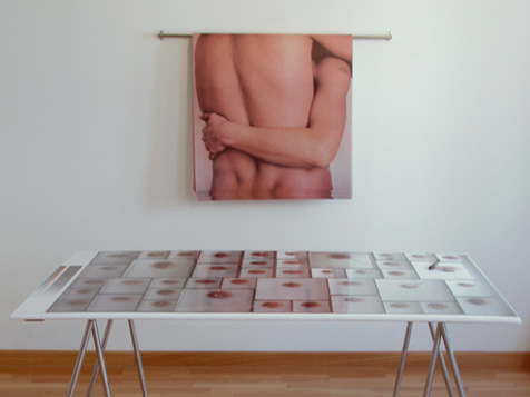No extremo oposto da sala de exposição, numa montagem que replica os locais de embrulho de qualquer estabelecimento comercial, encontramos papel de embrulho com a reprodução de dois corpos que se abraçam. O trânsito constante entre a dimensão afectiva (o abraço) e funcional (o papel para embrulhar) situa a intervenção da artista, como se disse, num plano que tenta curto-circuitar o modo como convencionalmente separamos as esferas do amor e do trabalho, do prazer e da produtividade. Ora este papel destina-se a embrulhar obras que eventualmente sejam vendidas, o que um colaborador da galeria terá de executar mediante um conjunto de determinações prévias: a obra retirada da parede terá de ser fotografada e no seu lugar colocada uma polaroid com a sua reprodução (mais uma vez replicando um modelo de acção alheio, isto é, o do sistema museológico, que costuma colocar nas paredes fotografias das obras retiradas para empréstimo ou para restauro). De seguida, o comprador é convidado a deixar uma mensagem numa fotografia que envolve a mesa onde se fazem os embrulhos que reproduz a parede ainda com as obras todas, mais especificamente em cima da imagem da obra adquirida. Neste processo, à partida controlado pela artista, muito naturalmente se vão tecendo intercâmbios de experiências positivas (pois este será, com certeza, o estado de espírito de quem se predispõe a adquirir um trabalho), numa circularidade que parece ter sido precisamente concebida para se tornar imune a qualquer tipo de influência ou leitura negativa do exterior.